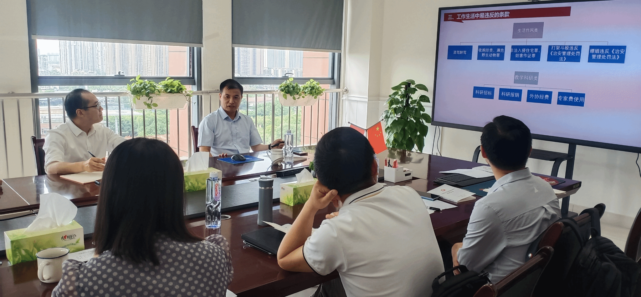 张国正以“学好用好条例,守好纪律底线”为主题,围绕《条例》制定及修订情况、工作中易违反的条款两个重点方面,通过丰富的案例,以案说法、以案明纪,向参会人员讲授了一堂精彩的党纪学习教育专题党课。会议要求,学院党员干部要时刻保持清醒头脑,坚守廉洁底线,把遵规守纪刻印在心,内化为言行准则,进一步强化纪律意识,加强自我约束,增强政治定力、纪律定力、道德定力和抵腐定力,确保学院党委和师生支部政治过硬、确保党员干部和师生员工政治可靠、确保学院实现政治生态清明。