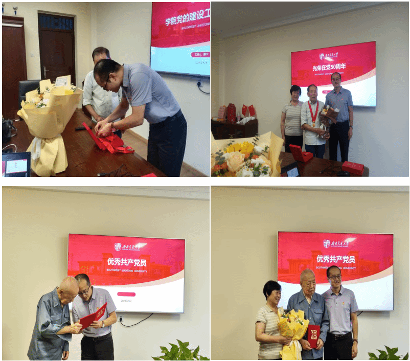 紧接着,廖军宣布根据学院《2021-2023年“两优一先”评选表彰工作方案》(西交马院党〔2023〕06号),由支部评议推荐、学院党委审核,经学院2023年第6次党委会审定通过,并经表彰名单公示,学院党委决定,授予离退休党支部朱铃、马黎两位党员同志为学院2021-2023年两优一先优秀共产党员称号,同时向光荣在党五十年的干学衡同志颁发了勋章和荣誉证书,对他们为学院和学校作出的重大贡献表示衷心的感谢。