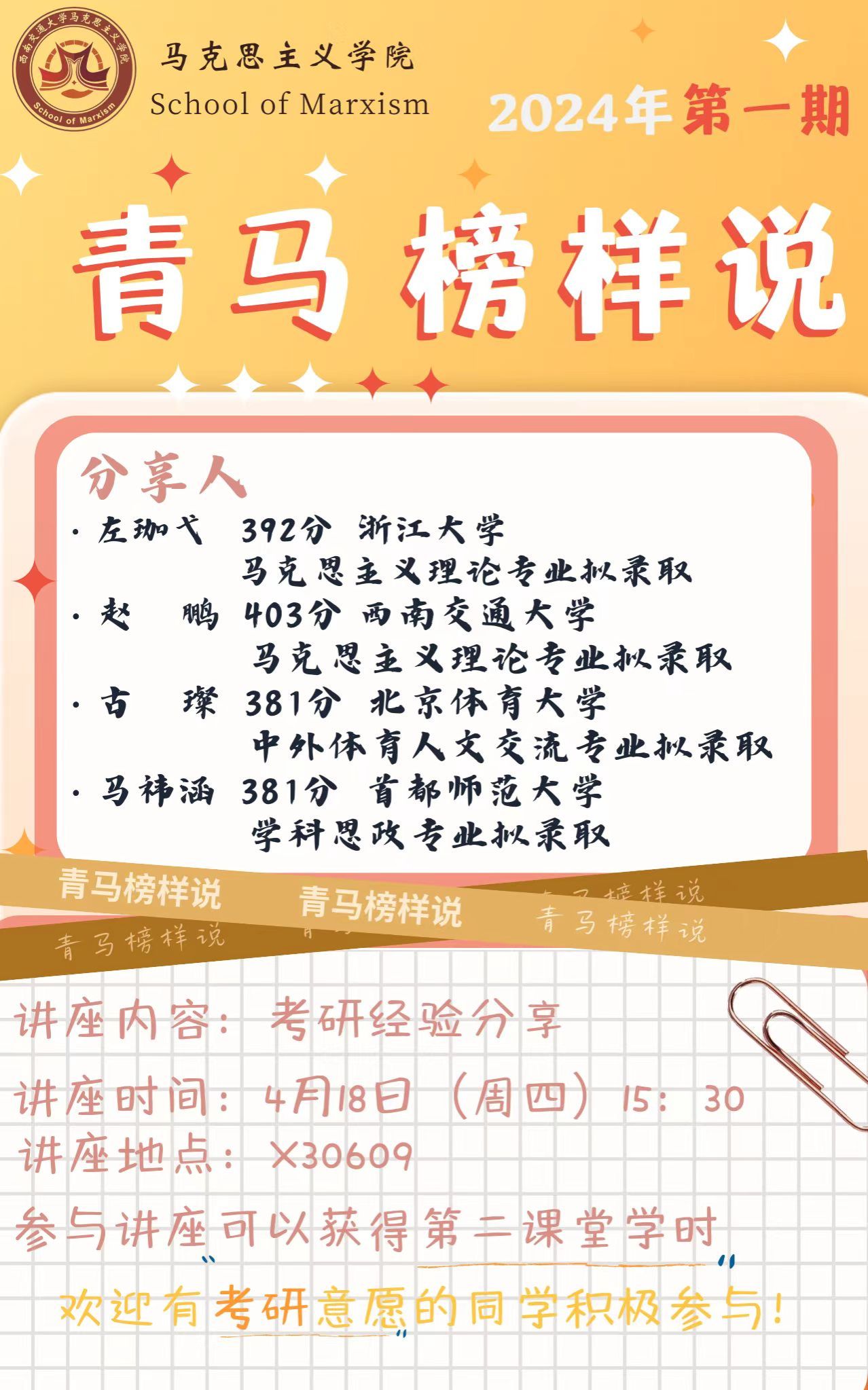 将于4月18日15:30组织“青马榜样说”考研经验分享会。现将有关事宜通知如下: