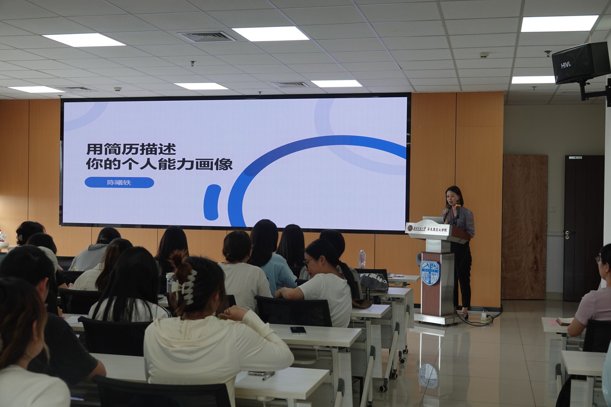 招生就业处生涯教育与就业指导科科长陈曦轶主讲,学院党委副书记邓秀芸主持,学院朱方方、杨雪莲以及辅导员和院内外60余名学生参加。