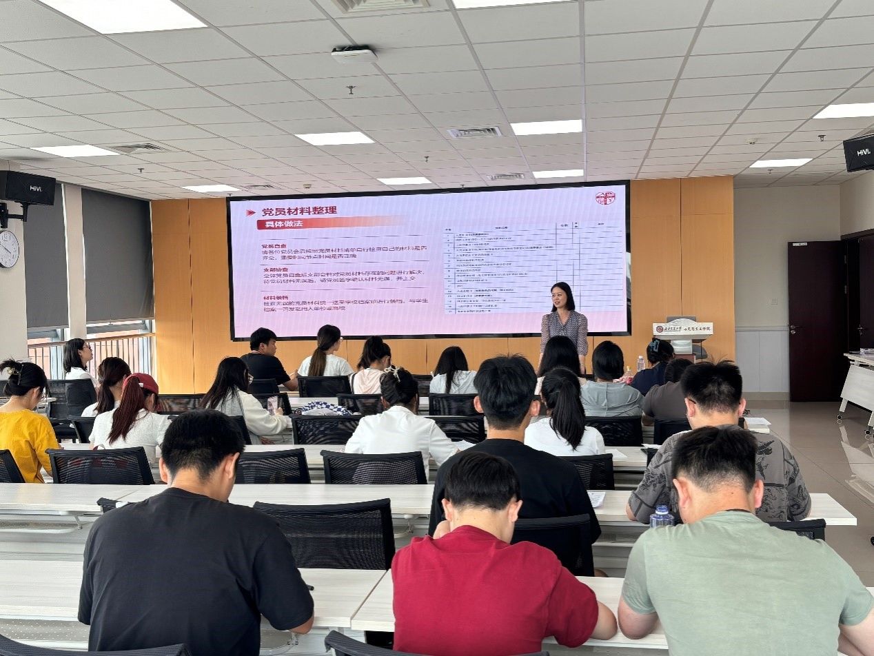 本科第一党支部副书记王筠然对党组织关系转接和党员档案核对进行了介绍。王筠然强调了党组织关系转接的时间安排,并罗列了党员材料清单,带领支部同志们进行详细核查,针对档案材料查缺补漏。