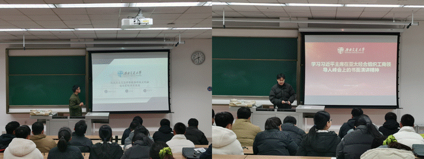 博士班党支部冉新月同志作了《习近平总书记在第四次“一带一路”建设工作座谈会上的重要讲话》的分享,详细解读了“一带一路”倡议对我国对外开放及全球合作的重要意义。她在分享中强调,党员应增强全球视野,在推动“一带一路”倡议实施的过程中,积极为国家和世界的发展贡献力量。