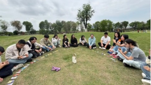 为促进学科交融、疏解学业压力,学院同心理研究与咨询中心联合举办“心灵共振·音愈同行”草地音乐会团辅活动,2024级硕士班学生积极参与。活动以“声音冥想”开场,同学在引导下聆听颂钵与吉他协奏放松身心,在音乐疗愈中感受学科交融;以“桃花朵朵开”和“大风吹”等互动游戏打破专业界限; “心理欧卡”环节,王同学以“沙漠绿洲”卡牌结合唯物辩证法分析,引发对理论与实践结合的深入思考。