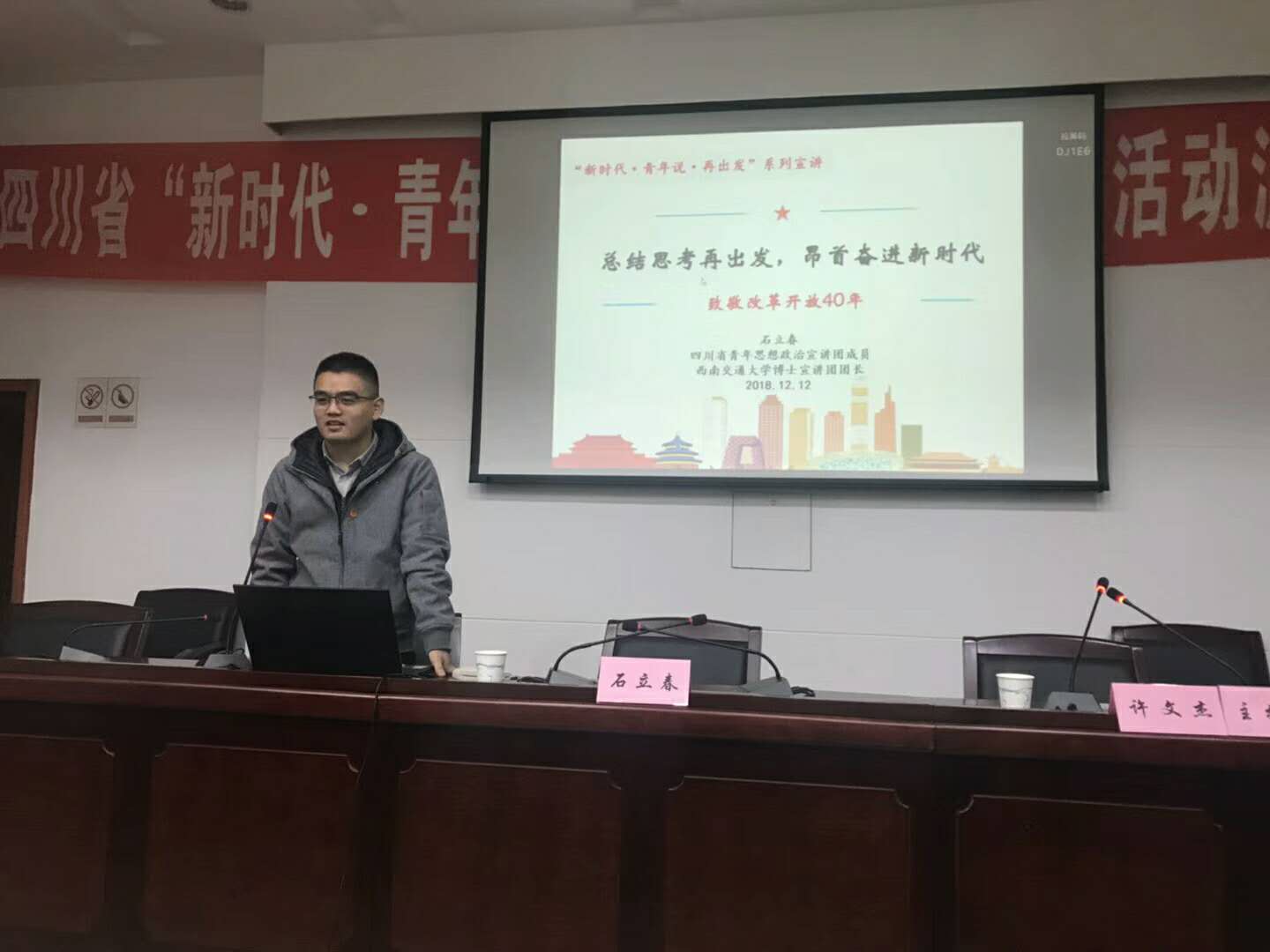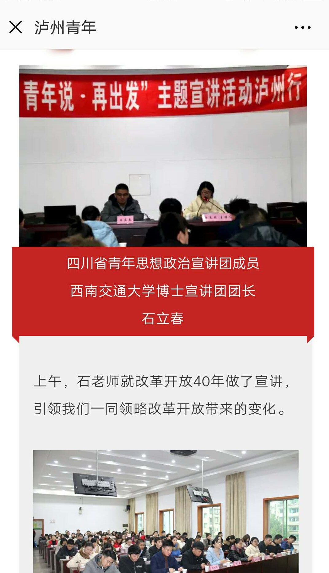 12月12日9:00-11:30,四川省青年思想政治宣讲团泸州行第一站来到了纳溪区,四川省青年思想政治宣讲团成员、瓜子tv 博士宣讲团团长石立春老师进行题为《总结思考再出发,昂首奋进新时代》的宣讲。此次宣讲在纳溪区委大礼堂,吸引了来自泸州国家高新区纳溪科技园和泸州纳溪经济开发区的众多企业青年,还有镇街道团委书记、副书记,农村青年代表等。宣讲活动由泸州市纳溪区团委副书记许文杰主持。