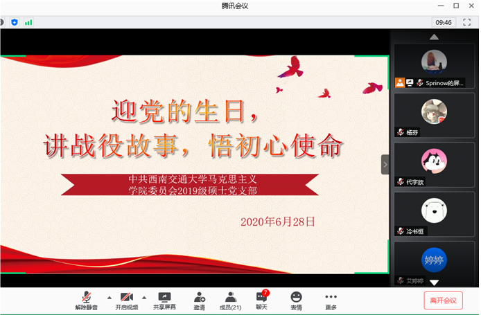 2019级硕士研究生党支部在腾讯会议平台,于2020年6月28日下午15:30,举行了以“迎党的生日、讲战役故事、悟初心使命”为主题的组织生活会,此次会议主要围绕三个方面进行。