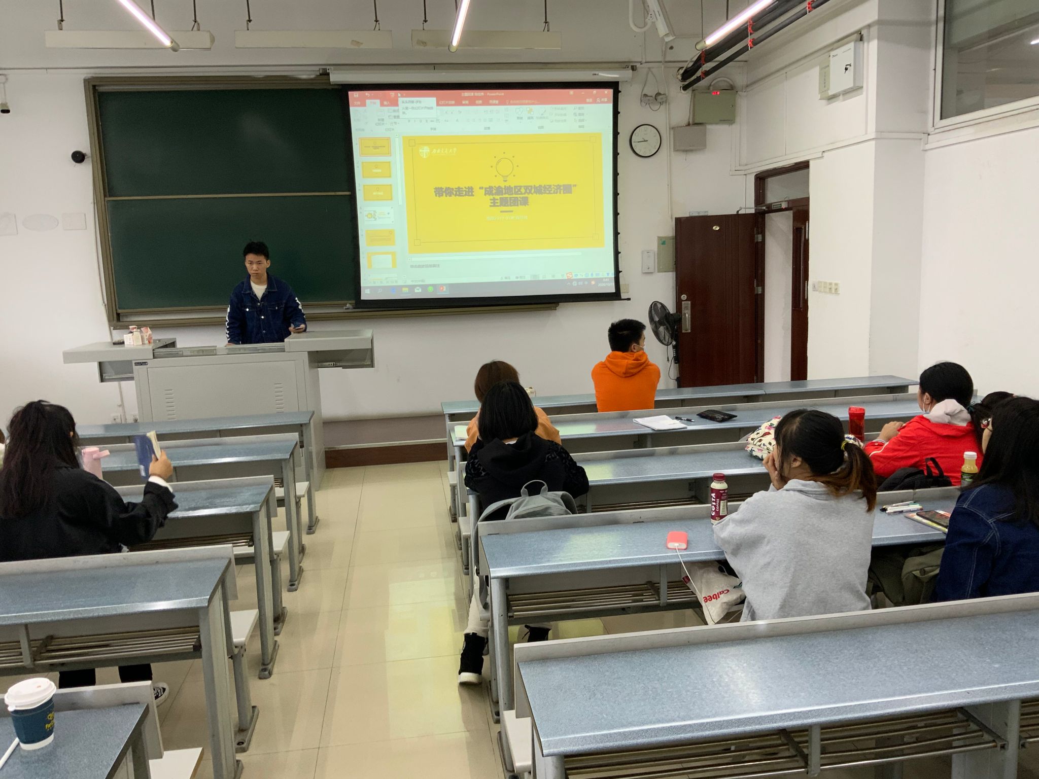 团支书陈佳伟同学首先用一段视频简要介绍了成渝地区双城经济圈的概况,随后帮助同学们了解“成渝地区双城经济圈”、“交通强国战略”两个名词。他以《成渝经济区经济规划》等政府文件为线索串起了成渝经济圈发展的历程。