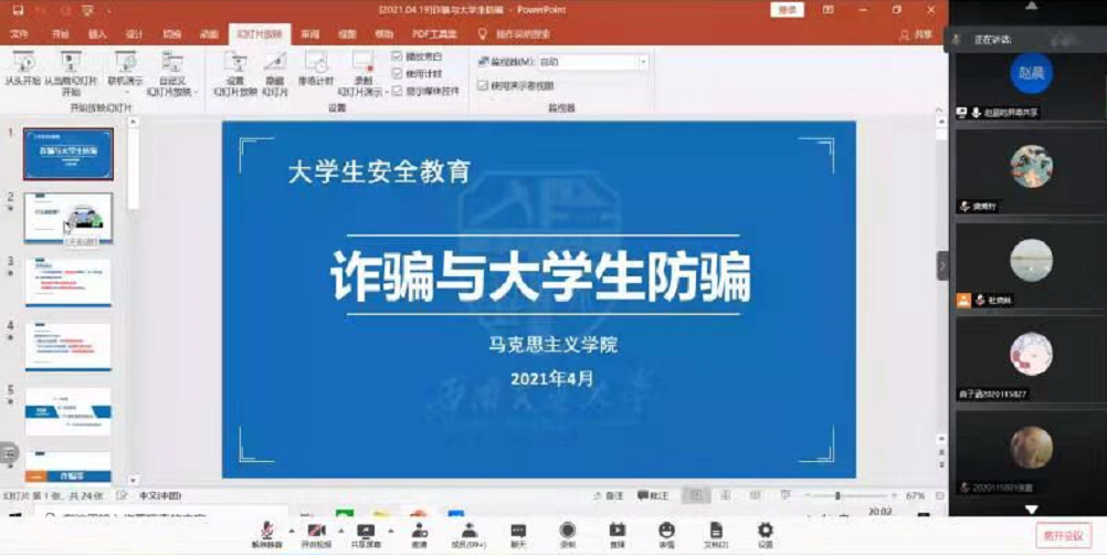 4月19日20:00,瓜子tv 在腾讯会议线上开展“预防电信诈骗,共建安全校园”讲座,由辅导员赵晨老师主讲,辅导员杜晓林老师和全体本科生共同参与。