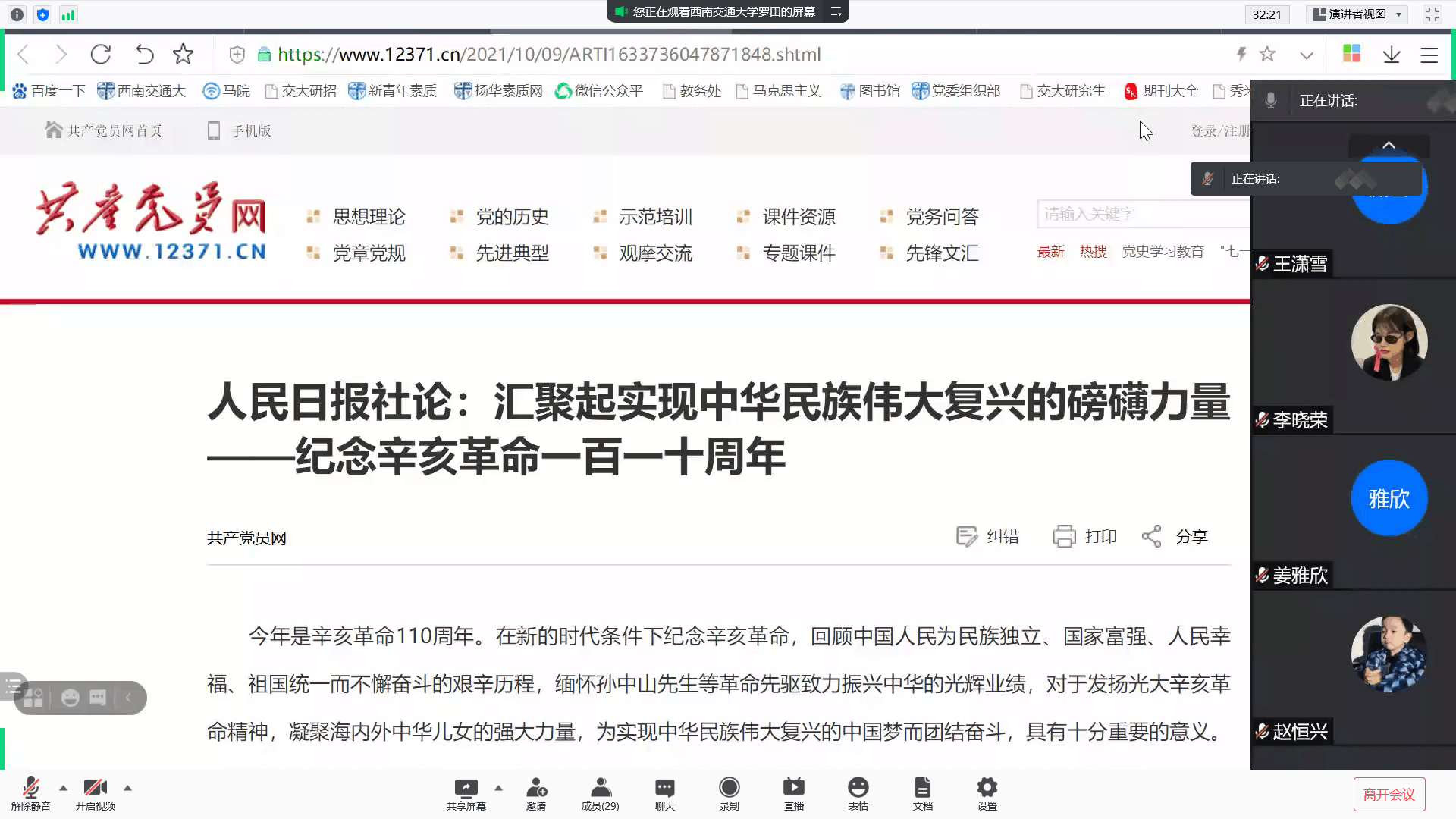 随后,刘京缘、郭修远、丁凡琪等同志围绕习近平总书记的重要讲话分享了个人学习心得,她们一致认为,习近平总书记在纪念辛亥革命110周年大会上的重要讲话鼓舞人心,催人奋进。作为奋斗在实现全面建成社会主义现代化强国的第二个百年奋斗目标征程上的青年党员,应该更加紧密地团结起来,在党的领导下,认真学习、艰苦奋斗,携手向着中华民族伟大复兴的目标继续奋勇前进!
