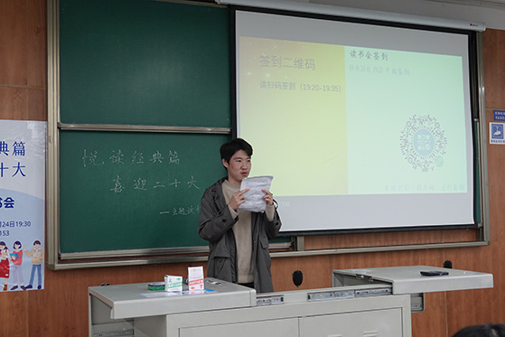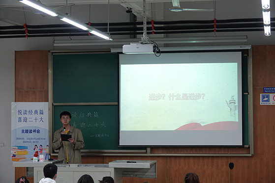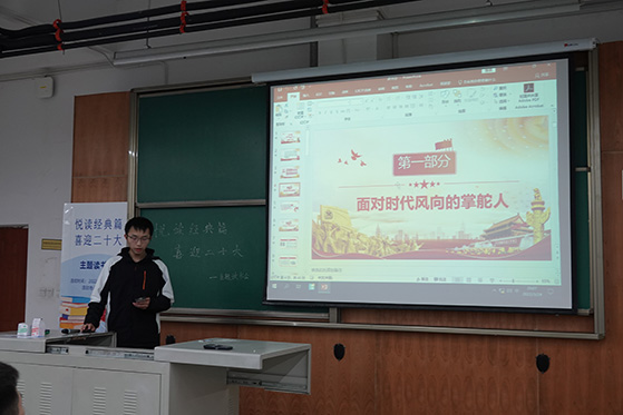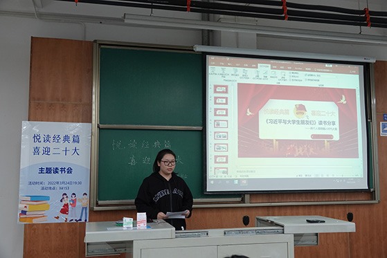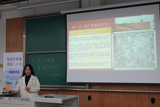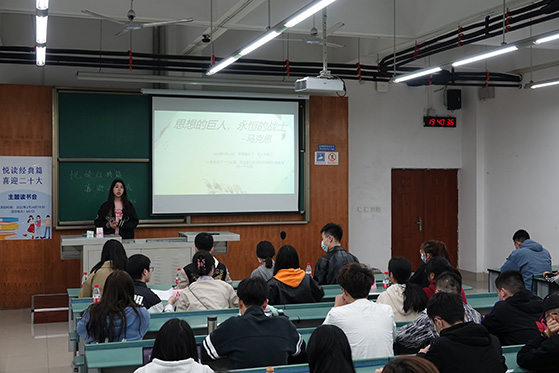 于3月24日19:30在X4153举办“悦读经典篇,喜迎二十大”主题读书会,会议由2020级同学陈帅锟主持,马院全体本科生共同参与。