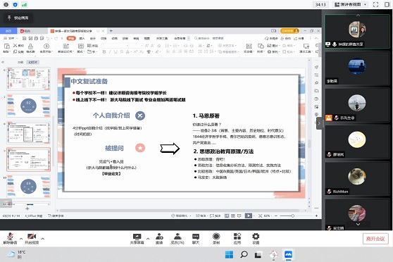 依托腾讯会议举办了“青马榜样说”第二期考研经验分享会活动。本次分享会邀请到2018级本科生尹思棋、吴文娟、钟源三位同学进行经验分享,全体本科生共同参与。首先,尹思棋同学为大家介绍了自己的备考经验,从各个科目的准备做出了细致入微的经验分享,并推荐了一些学习马克思主义理论的资源。接着,吴文娟同学分享了自己备考的心态调整与计划安排。同时也分享了具体的学习技巧和应试准备。最后,钟源同学从理论学习储备和复试准备两个方面进行了经验分享,为同学们的考研之路提供了新思路。本次经验分享,进一步激发了大家的学习动力,让广大同学积累了一些解决处理学习生活与考研准备关系的有效方法,有利于在下一个阶段总结、明确自己的目标,制定合理的复习、择校、面试计划。
