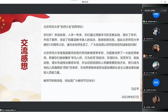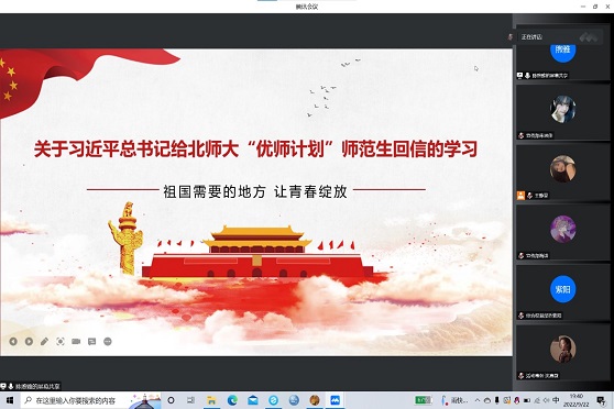 学生会召开线上专题学习会,组织同学们学习习近平总书记给北师大“优师计划”师范生的回信。本次专题学习会由学生会组织部部长陈煦雅主持,瓜子tv