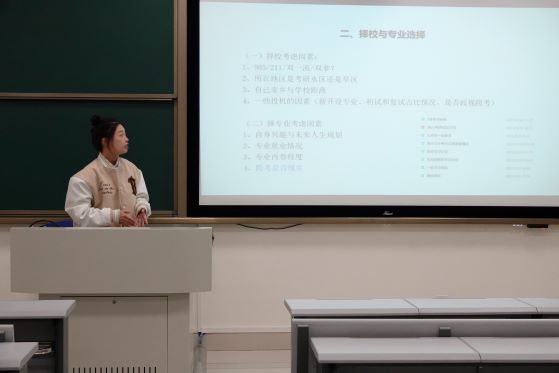 姚思雨同学重点分享了自己跨考的经历,她认为大家在备考前一定要慎重对待择校与专业选择并合理安排复习时间;要合理使用思维导图构建自己的答题模板和知识框架。同时她对学弟学妹们提出的“如何学好英语”“一天的学习时长”“课程和考研如何平衡”“考研与休息”等问题进行了具体的回答。