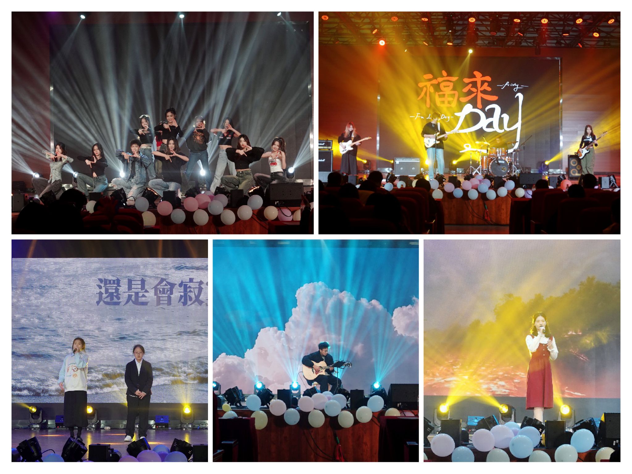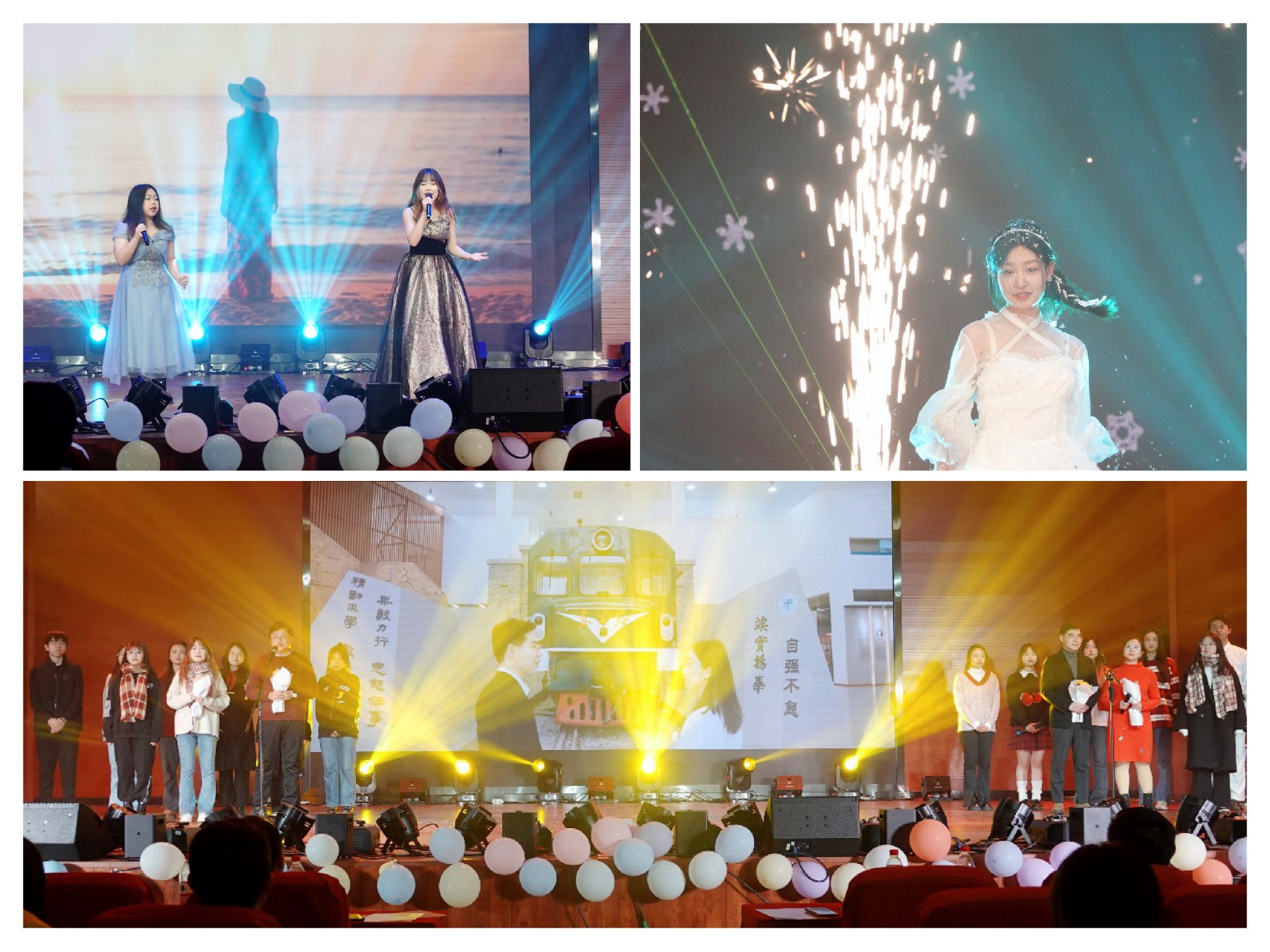 在“第一篇章:辞旧岁——回望来时路”中,音符飘荡,歌声悠扬,同学们载歌载舞,以余音绕梁的曲调与绚丽的舞姿为观众来了视听盛宴。伴随着欢快的节奏,演出正式拉开了帷幕。福来day乐队带来的《闹海》和《8+8=8》两首歌曲作为开场节目点燃了现场的热情,烘托出晚会现场喜悦的气息。符俊婷同学带来了歌曲《我是如此相信》,以充沛的情感表现了彷徨无措时,信任给予人们柳暗花明,奋起再出发的勇气。关靖睿同学拨动琴弦,送上吉他演奏《流行的云》,诠释出云卷云舒,追忆流年的宁静安逸。以刘文欣等同学为代表的街舞社以青春的姿态,活力四射的舞姿表演舞蹈《幻想童话》,带观众重温儿时的童话幻想。于欣禾、刘祥宇同学带来的歌曲《还是会寂寞》,让我们学会直面寂寞,找寻自我,在星辉斑斓里放歌。