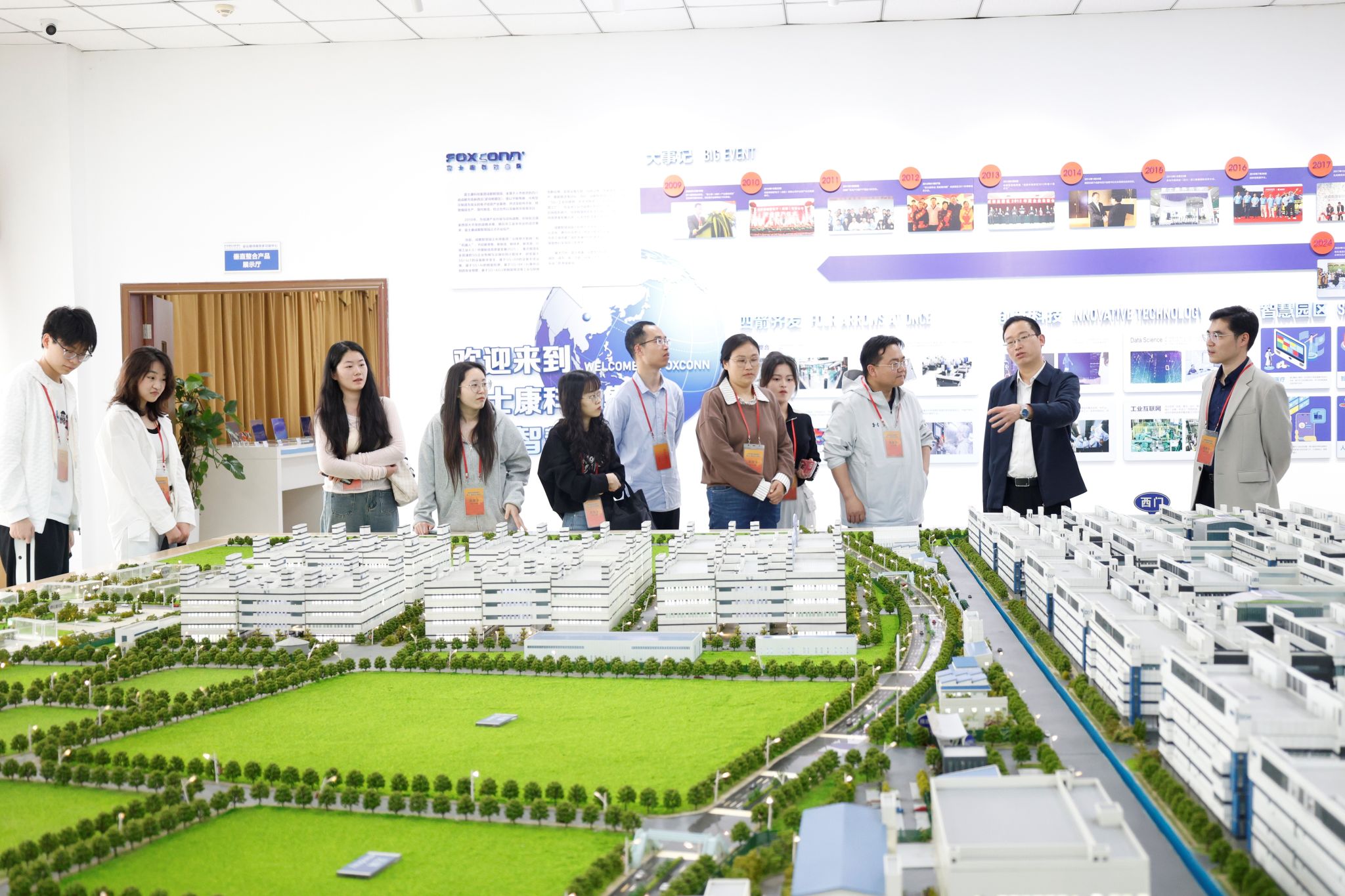 师生党员参观了工业园区,介绍了企业发展历程、核心产业现状、人员组织情况等。谭书记详细阐述了富士康集团近年来在党的组织建设、人才发展和科技创新方面取得的丰硕成果,并就“1562”党建工作法进行了详细讲解,包括“六大体系”、“十大品牌”、“一个中心、两个重点、三个原则、四个愿景”工作方针等具体内容,展示了非公企业党建的工作方法和特色亮点。