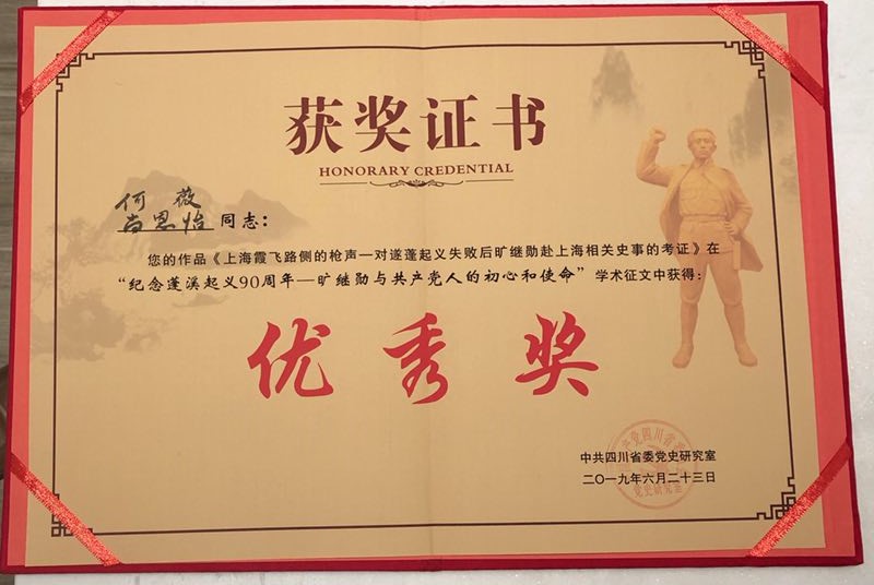 谢兴志、何薇、李子重撰写的《从遂蓬武装暴动看二十年代党的四川军运工作及其启示与思考》获二等奖;何薇、尚恩怡撰写的《上海霞飞路侧的枪声——对遂蓬起义失败后旷继勋赴上海相关史事的考证》获优秀奖。团队成员将再接再励,不忘初心,继续努力。