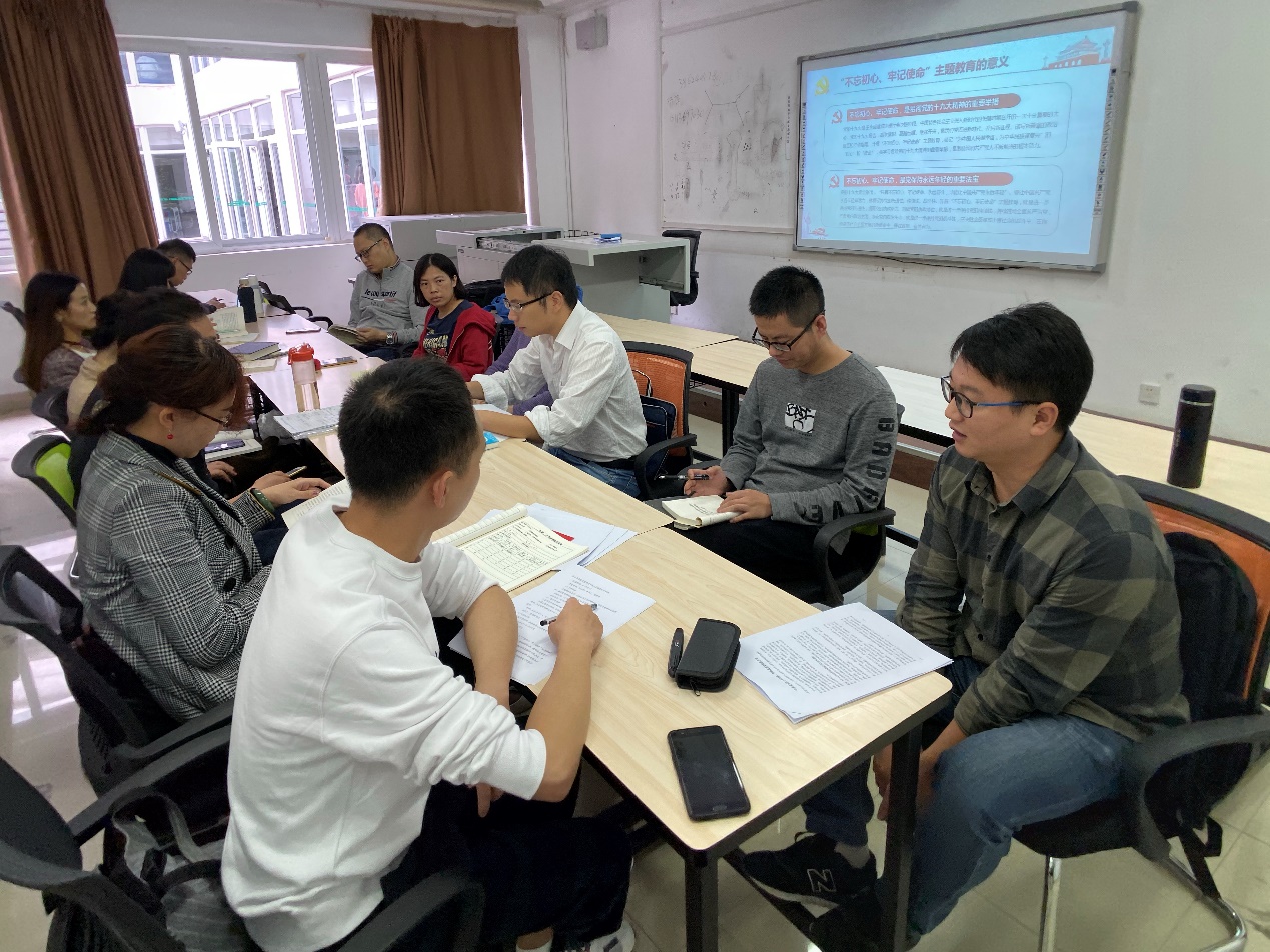 其次,邢斐同学从“不忘初心、牢记使命”主题教育的背景,内涵,要求,意义等四个方面与大家做了分享交流。与会党员在前期自学《习近平关于“不忘初心、牢记使命”论述摘编》的基础上,聚焦学习贯彻习近平总书记关于“不忘初心、牢记使命”的重要论述进行研讨。