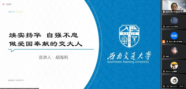 在宣讲分享环节,西南交大博士宣讲团优秀宣讲员胡海利回顾了交通大学在强国兴国征程中所发挥的重要作用以及交通大学人的奋斗故事,她认为青年们应当把人生理想融入国家和民族事业之中。