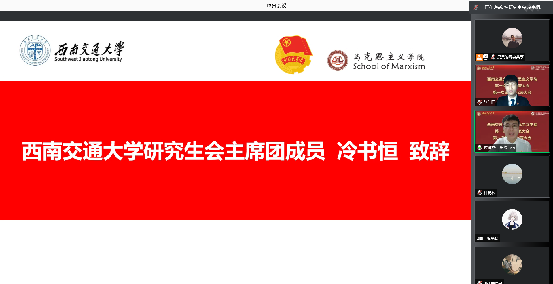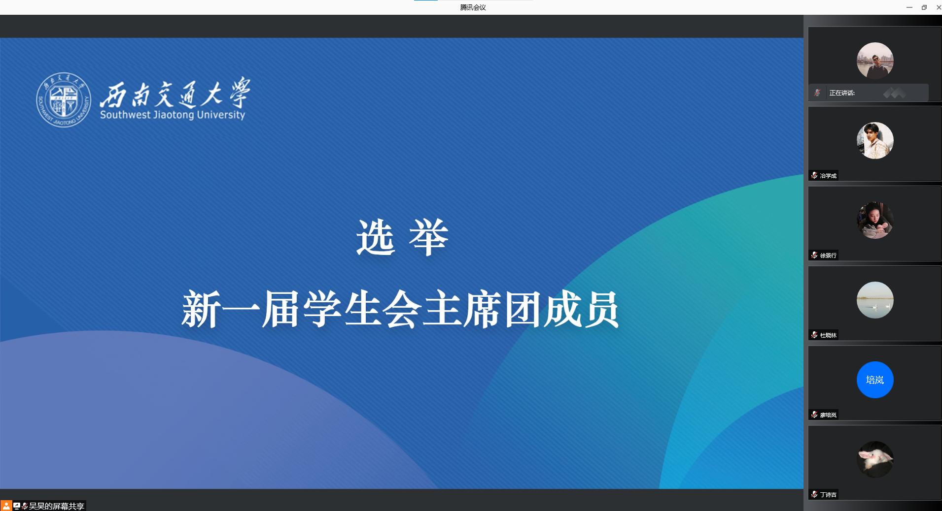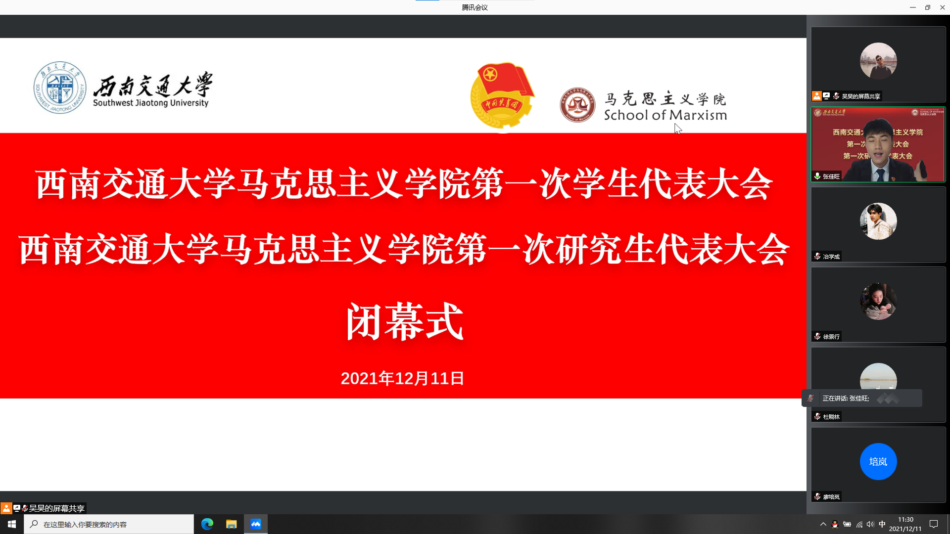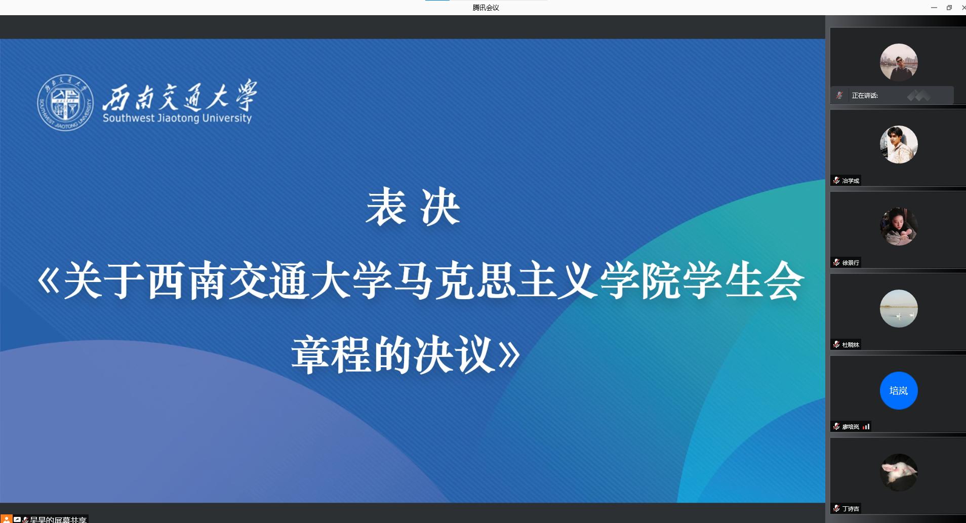 于2021年12月11日召开了学院第一次学生代表大会、第一次研究生代表大会。为积极配合学校疫情防控工作,本次大会通过腾讯会议线上举行。本次大会应到本科学生代表24人,实到24人;应到研究生代表20人,实到20人。院党委副书记熊钰、院团委书记赵晨、院团委副书记杜晓林、李浩,校学生会主席团成员王晓婷、校研究生会主席团成员冷书恒,以及部分兄弟学院学生会主席、研究生会主席出席大会开幕式。