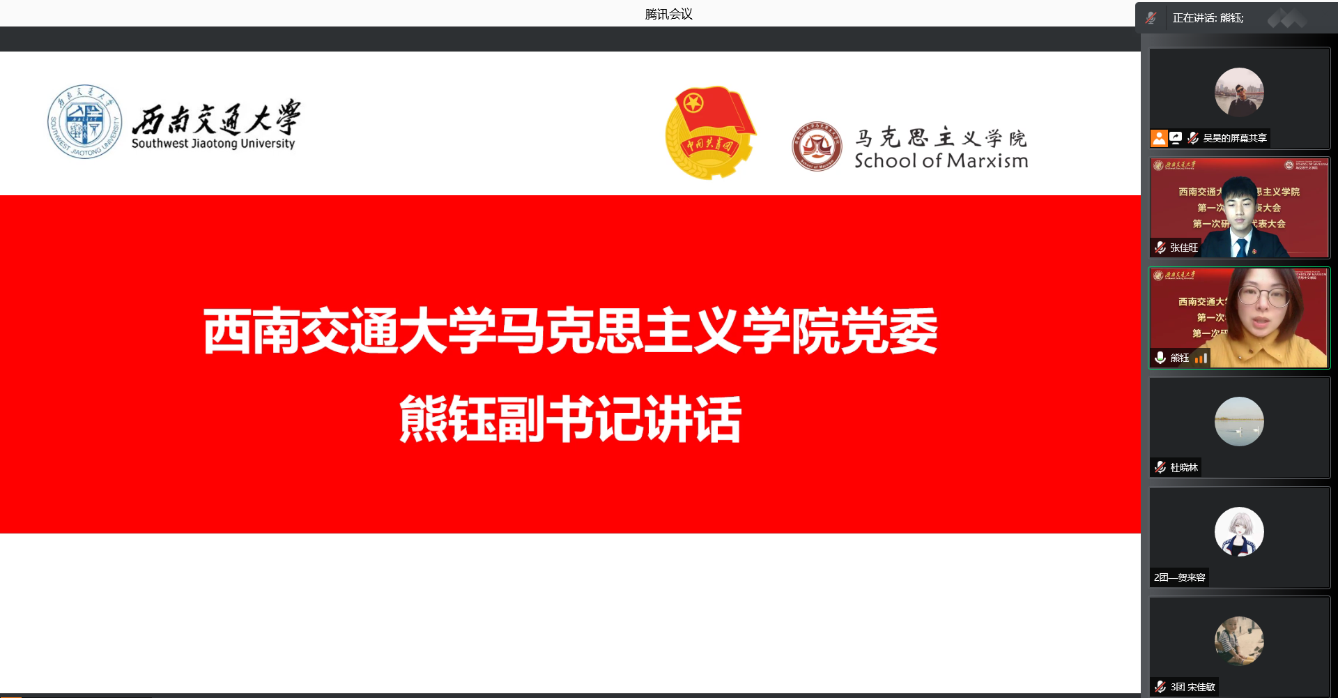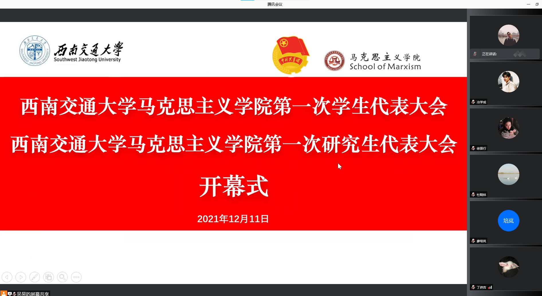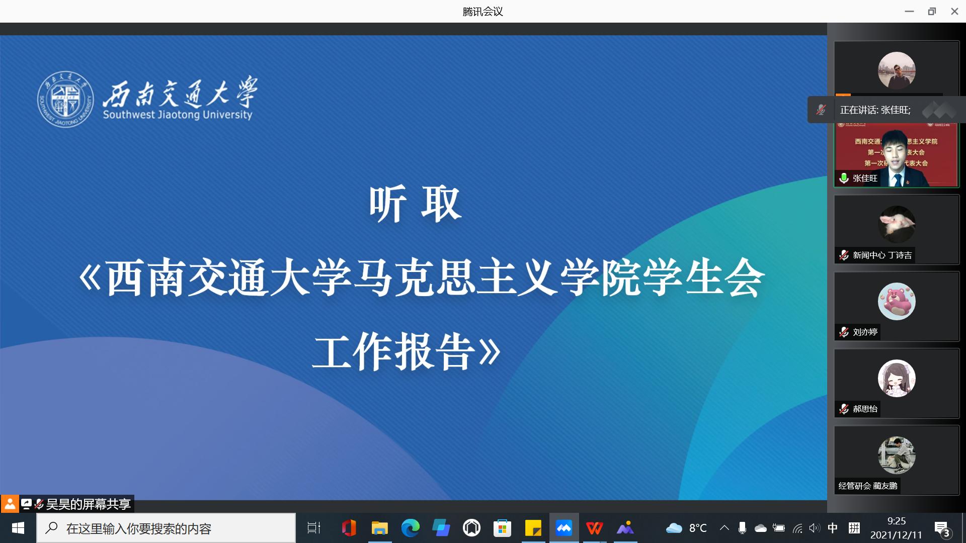 于2021年12月11日召开了学院第一次学生代表大会、第一次研究生代表大会。为积极配合学校疫情防控工作,本次大会通过腾讯会议线上举行。本次大会应到本科学生代表24人,实到24人;应到研究生代表20人,实到20人。院党委副书记熊钰、院团委书记赵晨、院团委副书记杜晓林、李浩,校学生会主席团成员王晓婷、校研究生会主席团成员冷书恒,以及部分兄弟学院学生会主席、研究生会主席出席大会开幕式。