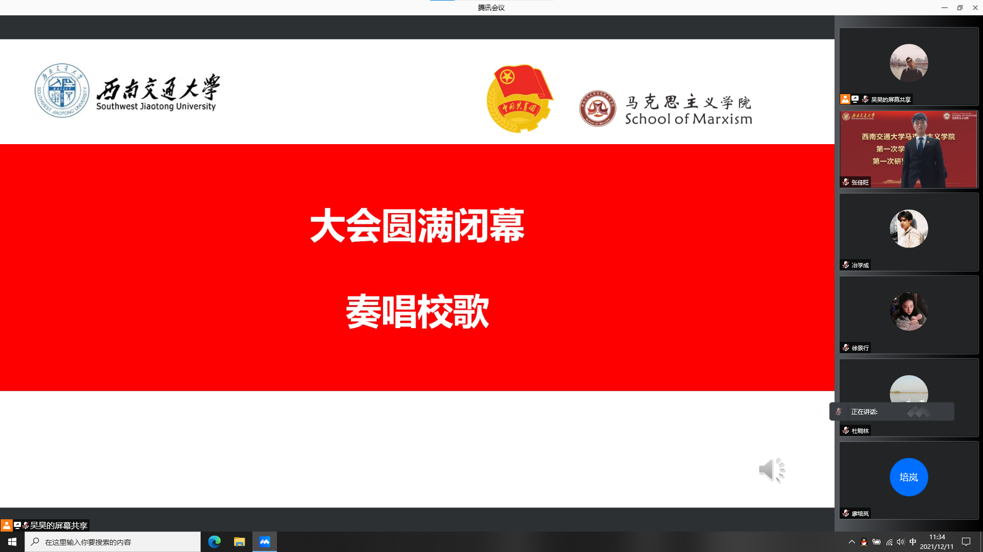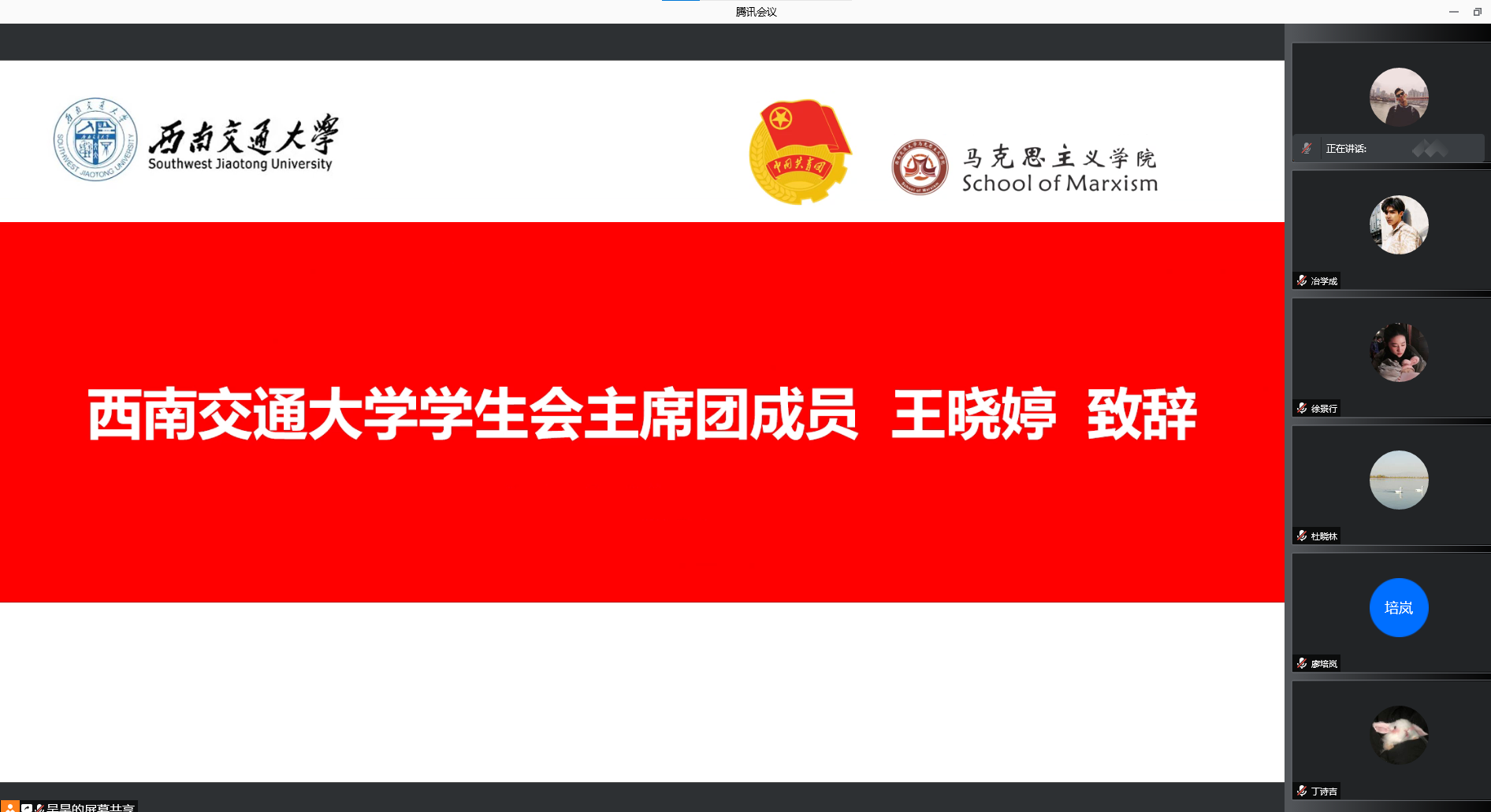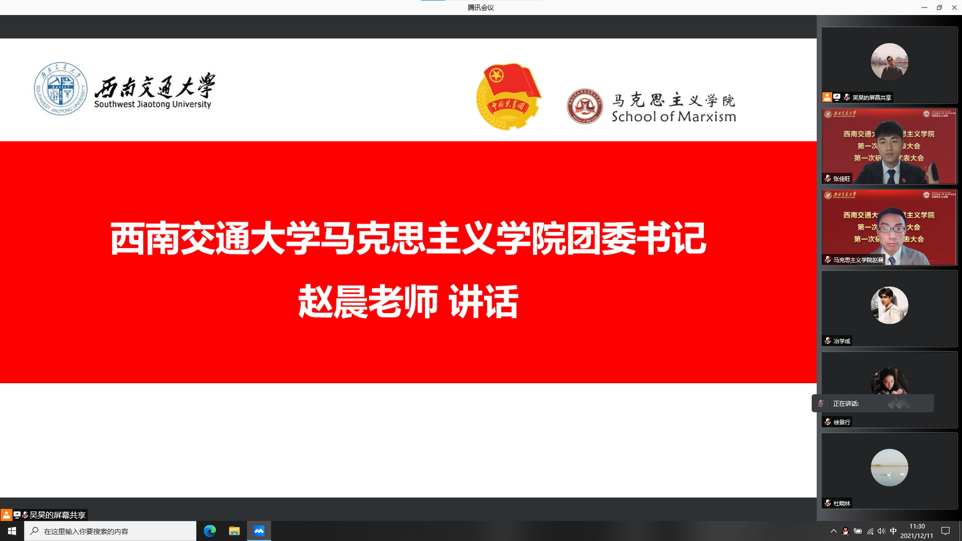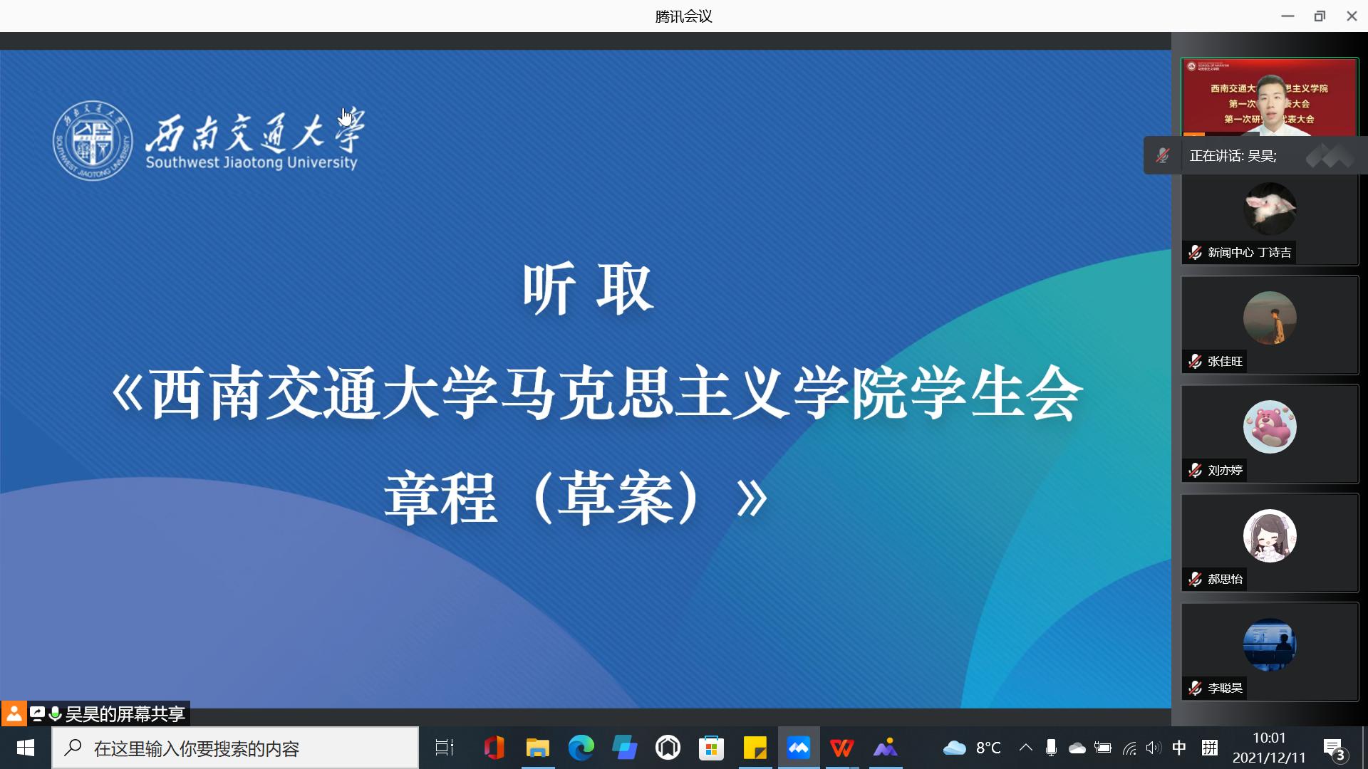 于2021年12月11日召开了学院第一次学生代表大会、第一次研究生代表大会。为积极配合学校疫情防控工作,本次大会通过腾讯会议线上举行。本次大会应到本科学生代表24人,实到24人;应到研究生代表20人,实到20人。院党委副书记熊钰、院团委书记赵晨、院团委副书记杜晓林、李浩,校学生会主席团成员王晓婷、校研究生会主席团成员冷书恒,以及部分兄弟学院学生会主席、研究生会主席出席大会开幕式。