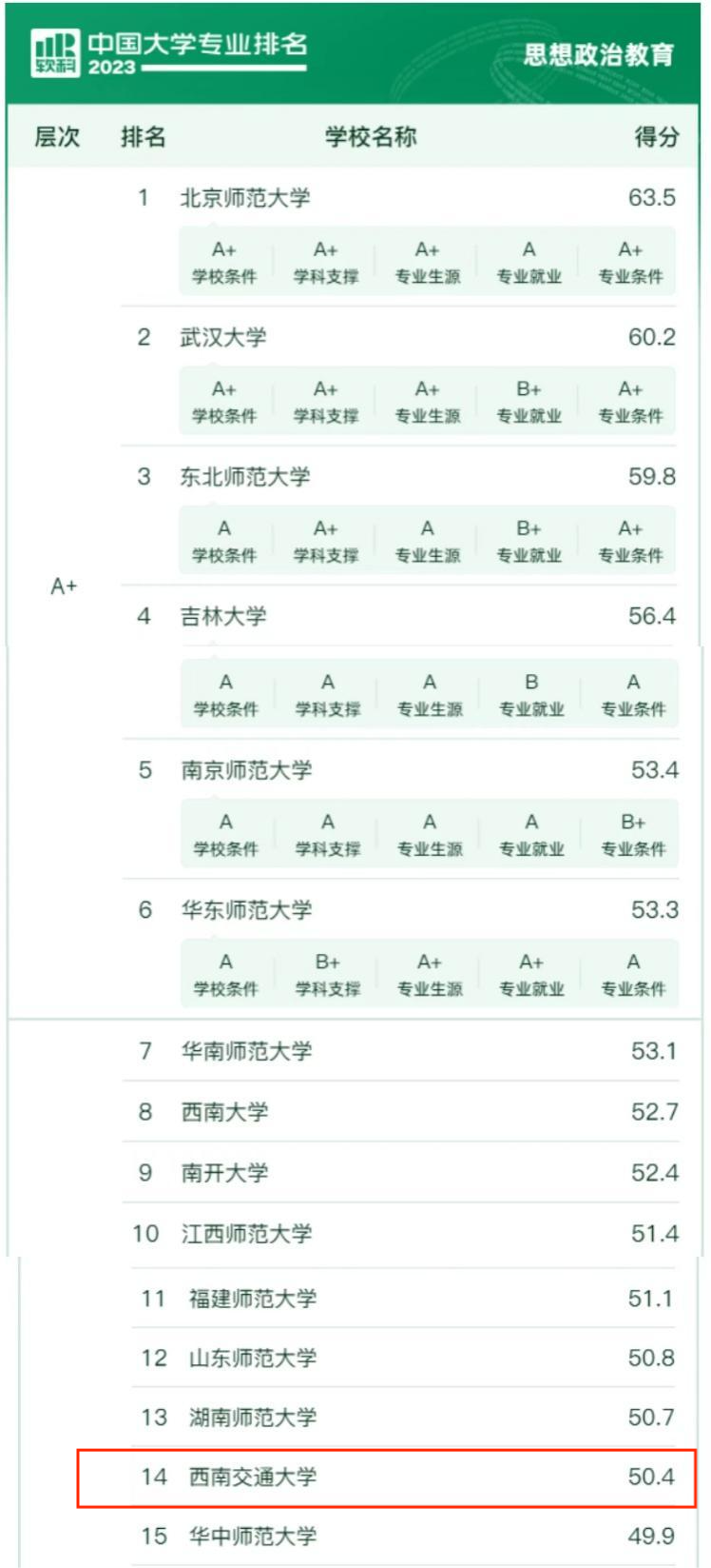 思想政治教育专业位居全国第14位,获评等级A。