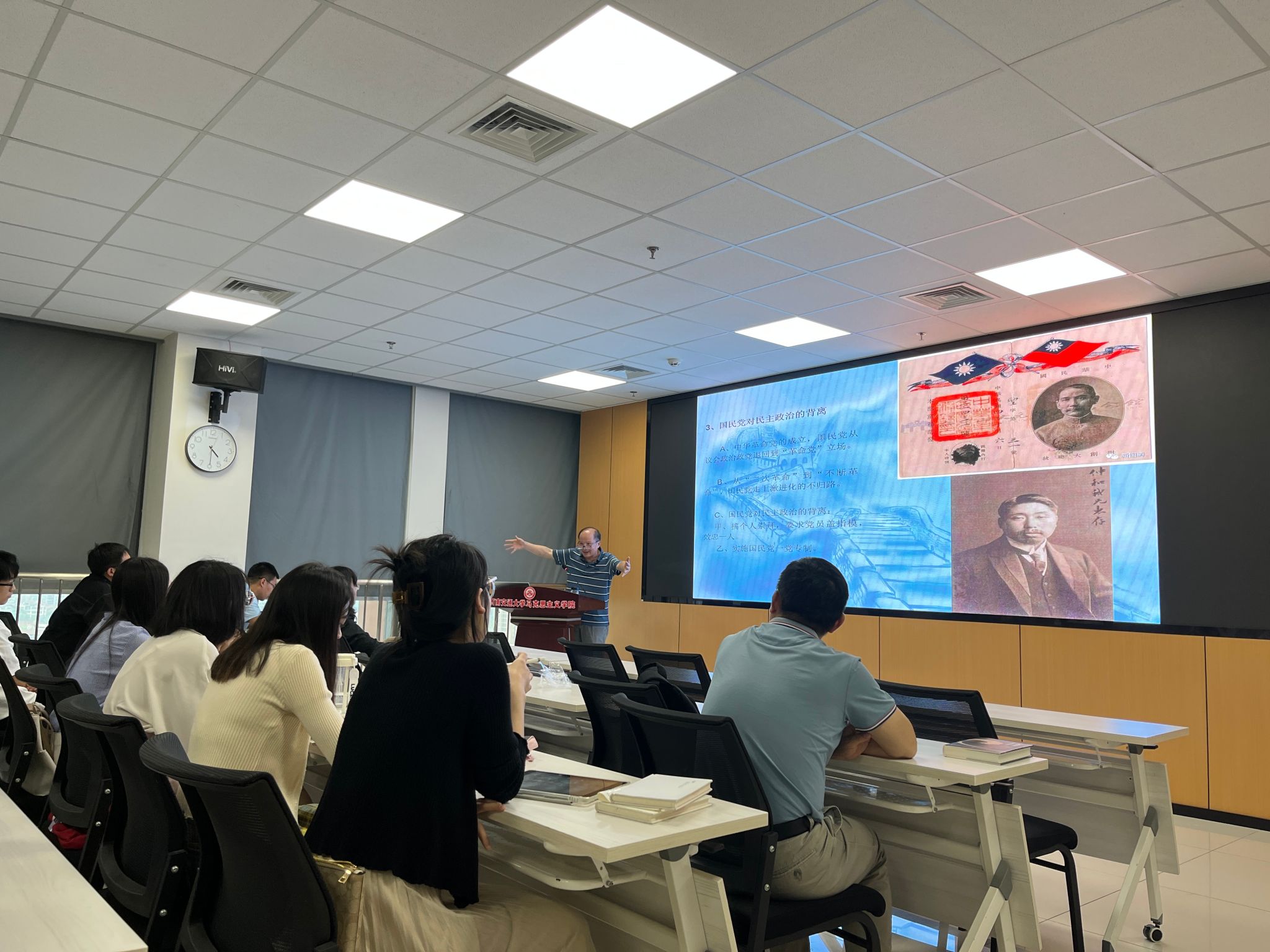 杨天宏教授以“不断革命”的肇端:“二次革命”与民初政治走向为主题,围绕理论知识和历史学科特色等方面进行了讲演。杨教授富有激情、启心明智地讲述深深触动着在场的每一位同学。杨教授凭借自己丰厚的学术积淀和独到的历史思维,给学生讲解分析了“宋教仁”案背后的历史溯源以及该事件对中国民主政治走向的影响。同时结合学生思维的特点,以“故事讲述”与“评述”相结合,生动有趣、耐人寻味,引得学生们纷纷拍手称赞。