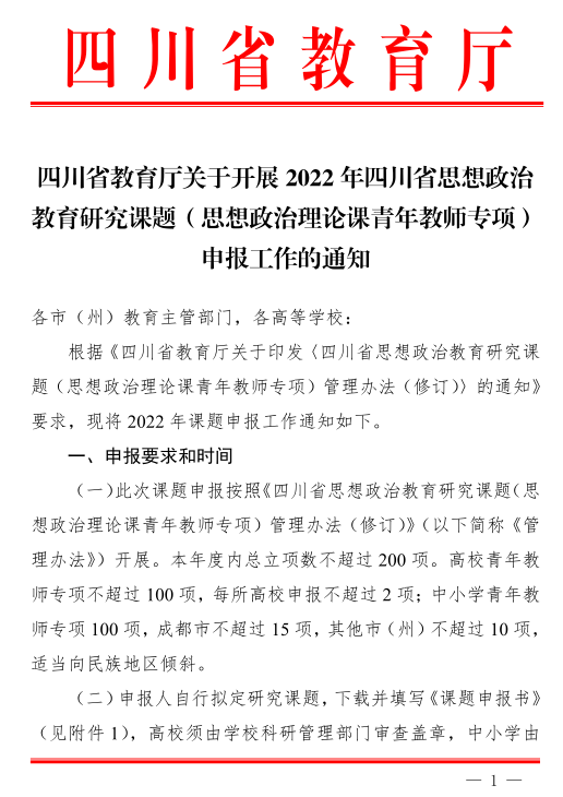 【科研通知】转发四川省教育厅关于开展2022年四川省思想政治教育研究课题(思想政治理论课青年教师专项)申报工作的通知