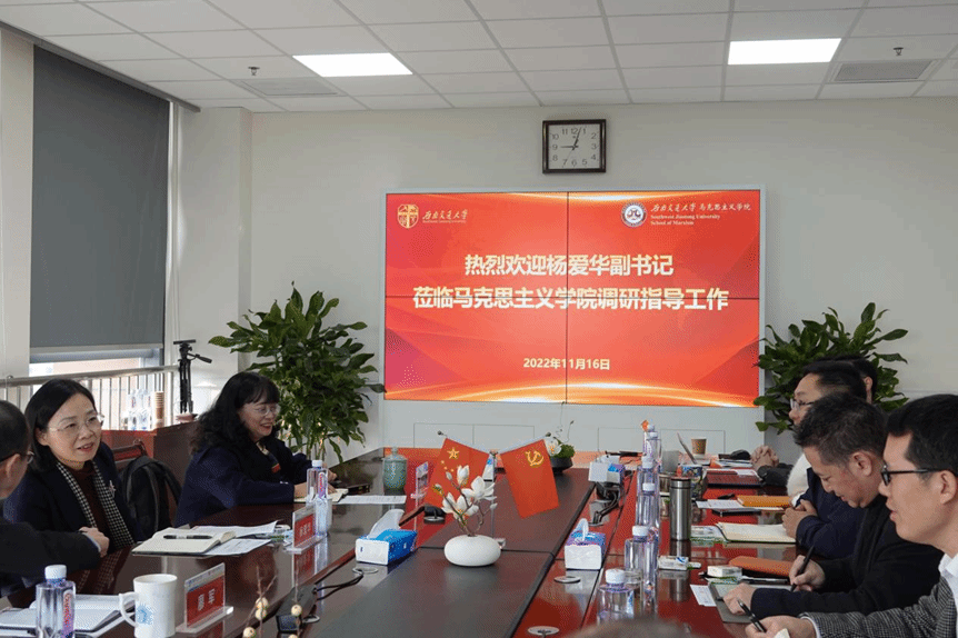 On the morning of November 16th, Yang Aihua, Deputy Secretary of the University CPC Committee, visited the School of Marxism for a panel on investigation and guidance. Members of the School’s management and faculty member representatives attended the meeting. Liao Jun, Party Secretary of the School of Marxism, presided over the meeting.