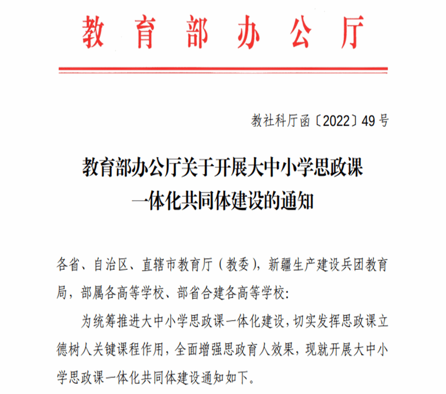 It’s reported that the Ministry of Education only supported and approved one ideological and political theory course integration community among universities, middle schools, and primary schools in each province, municipality directly under the Central Government, and autonomous region, which is guided by the provincial educational administrative department and implemented by the initiating university. Besides, the Ministry of Education provides special support for the construction of the ideological and political theory course integration community among universities, middle schools, and primary schools. It aims at sufficiently stimulating the enthusiasm of various regions, and navigating the situation judiciously according to circumstances and adapting to local conditions to build a batch of innovative and research-oriented platforms combining theory and practice and supply work platforms, practical experience, theoretical support, and decision consultation for promoting the theoretical research and practical exploration of the ideological and political theory course integration among universities, middle schools, and primary schools nationwide.