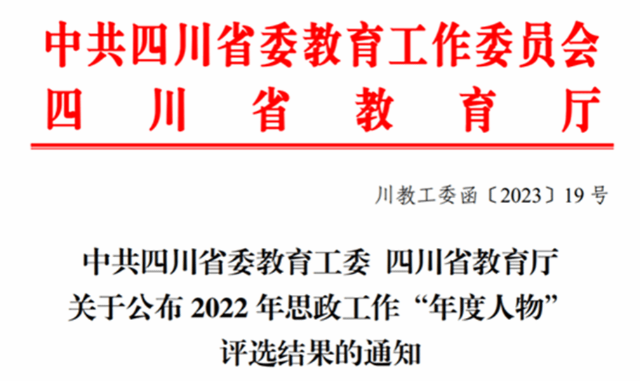 On February 17, 2022, the Education Working Committee of the CPC Sichuan Provincial Committee and the Department of Education of Sichuan Province announced the results of “Man of the Year” for ideological and political education work in 2022. The two faculty members of our school, Xie Yu and Liu Feng, stood out from numerous outstanding educators and were awarded relevant awards and nominations.