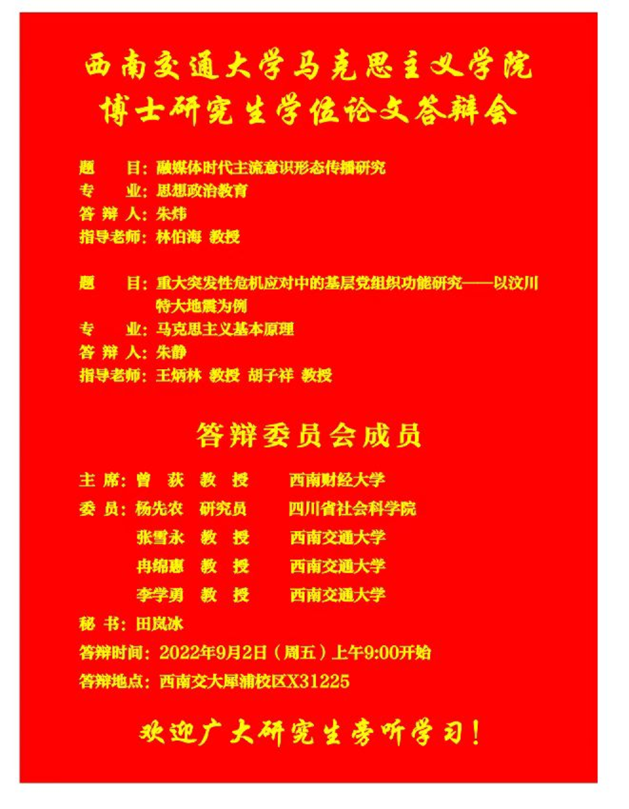 Defense Location: Xipu Campus X31225 of Southwest Jiaotong University