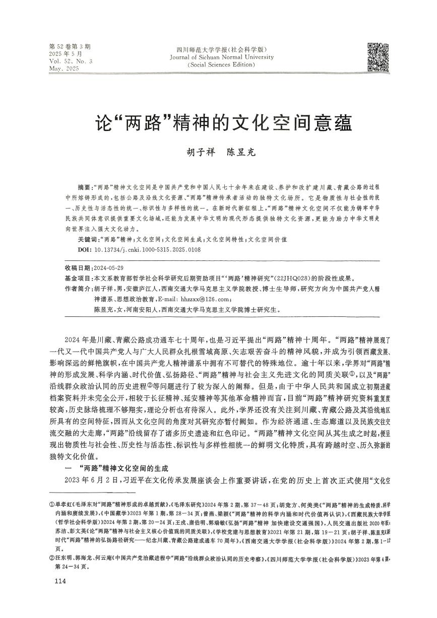 【科研论文】胡子祥,陈昱充. 论“两路”精神的文化空间意蕴 [J]. 四川师范大学学报(社会科学版), 2025, 52 (03): 114-122+204. DOI:10.13734/j.cnki.1000-5315.2025.0108.