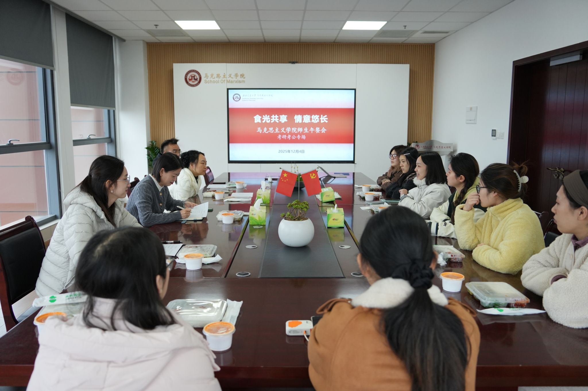 为助力学院本科生科学备战升学与就业,进一步加强师生沟通交流,12月4日中午,学院在X31225会议室举办“食光共享 情意悠长”师生午餐会(考研考公专场)。学院党委副书记邓秀芸、副院长王菁、思政2022级本科生班导师闫磊、本研学生代表齐聚一堂,在温馨融洽的氛围中共话成长、共叙未来。本次午餐会由本科生辅导员赵子涵主持。